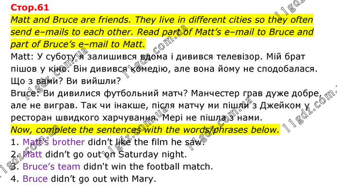 Matt and Bruce are friends. They live in different cities so they often send e–mails to each other. Read part of Matt’s e–mail to Bruce and part of Bruce’s e–mail to Matt. Matt: У суботу я залишився вдома і дивився телевізор. Мій брат пішов у кіно. Він дивився комедію, але вона йому не сподобалася. Що з вами? Ви вийшли? Bruce: Ви дивилися футбольний матч? Манчестер грав дуже добре, але не виграв. Так чи інакше, після матчу ми пішли з Джейком у ресторан швидкого харчування. Мері не пішла з нами. Now, complete the sentences with the words/phrases below. 1. Matt’s brother didn’t like the film he saw. 2. Matt didn’t go out on Saturday night. 3. Bruce’s team didn't win the football match. 4. Bruce didn’t go out with Mary.