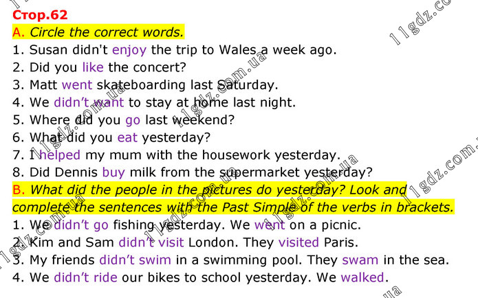 A. Circle the correct words. 1. Susan didn't enjoy the trip to Wales a week ago. 2. Did you like the concert? 3. Matt went skateboarding last Saturday. 4. We didn’t want to stay at home last night. 5. Where did you go last weekend? 6. What did you eat yesterday? 7. I helped my mum with the housework yesterday. 8. Did Dennis buy milk from the supermarket yesterday? B. What did the people in the pictures do yesterday? Look and complete the sentences with the Past Simple of the verbs in brackets. 1. We didn’t go fishing yesterday. We went on a picnic. 2. Kim and Sam didn’t visit London. They visited Paris. 3. My friends didn’t swim in a swimming pool. They swam in the sea. 4. We didn’t ride our bikes to school yesterday. We walked.