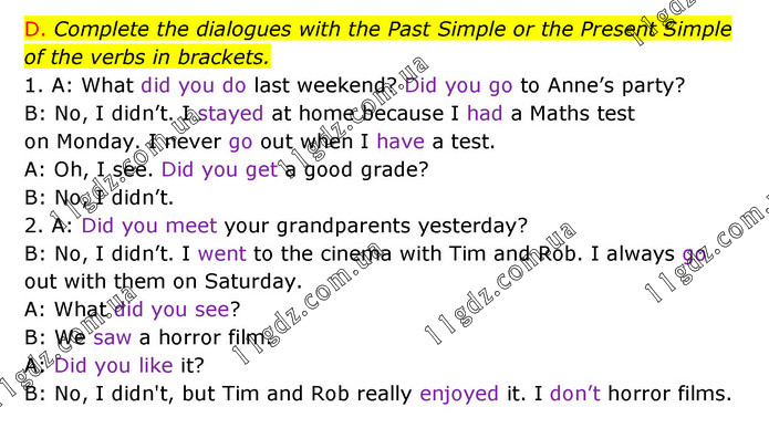 D. Complete the dialogues with the Past Simple or the Present Simple of the verbs in brackets. 1. A: What did you do last weekend? Did you go to Anne’s party? B: No, I didn’t. I stayed at home because I had a Maths test on Monday. I never go out when I have a test. A: Oh, I see. Did you get a good grade? B: No, I didn’t. 2. A: Did you meet your grandparents yesterday? B: No, I didn’t. I went to the cinema with Tim and Rob. I always go out with them on Saturday. A: What did you see? B: We saw a horror film. A: Did you like it? B: No, I didn't, but Tim and Rob really enjoyed it. I don’t horror films.
