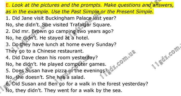 E. Look at the pictures and the prompts. Make questions and answers, as in the example. Use the Past Simple or the Present Simple. 1. Did Jane visit Buckingham Palace last year? No, she didn’t. She visited Trafalgar Square. 2. Did mr. Brown go camping two years ago? No, he didn’t. He stayed at a hotel. 3. Do they have lunch at home every Sunday? They go to a Chinese restaurant. 4. Did Dave clean his room yesterday? No, he didn’t. He played computer games. 5. Does Susan have pizza in the evenings? No, she doesn’t. She has a salad. 6. Did Susan and Ben go for a walk in the forest yesterday? No, they didn’t. They went for a walk by the sea.