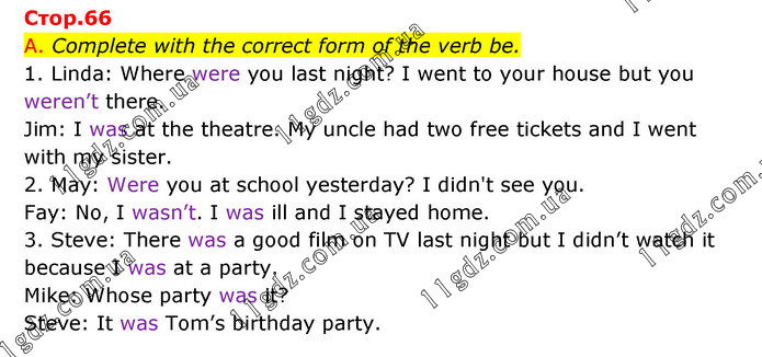 A. Complete with the correct form of the verb be. 1. Linda: Where were you last night? I went to your house but you weren’t there. Jim: I was at the theatre. My uncle had two free tickets and I went with my sister. 2. May: Were you at school yesterday? I didn't see you. Fay: No, I wasn’t. I was ill and I stayed home. 3. Steve: There was a good film on TV last night but I didn’t watch it because I was at a party. Mike: Whose party was it? Steve: It was Tom’s birthday party.