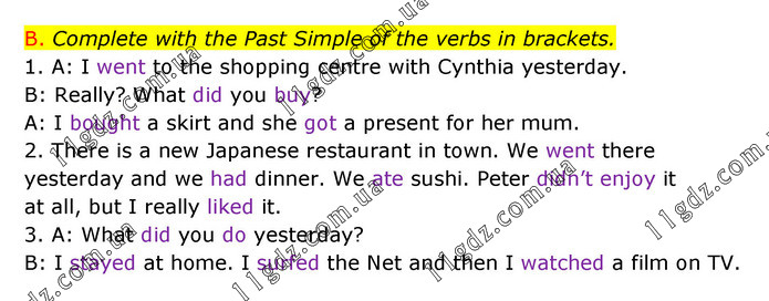 B. Complete with the Past Simple of the verbs in brackets. 1. A: I went to the shopping centre with Cynthia yesterday. B: Really? What did you buy? A: I bought a skirt and she got a present for her mum. 2. There is a new Japanese restaurant in town. We went there yesterday and we had dinner. We ate sushi. Peter didn’t enjoy it at all, but I really liked it. 3. A: What did you do yesterday? B: I stayed at home. I surfed the Net and then I watched a film on TV.