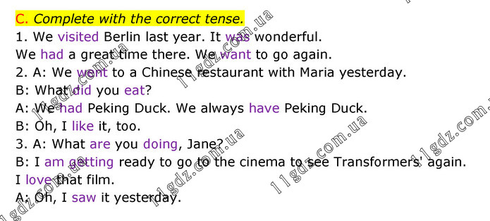 C. Complete with the correct tense. 1. We visited Berlin last year. It was wonderful. We had a great time there. We want to go again. 2. A: We went to a Chinese restaurant with Maria yesterday. B: What did you eat? A: We had Peking Duck. We always have Peking Duck. B: Oh, I like it, too. 3. A: What are you doing, Jane? B: I am getting ready to go to the cinema to see Transformers' again. I love that film. A: Oh, I saw it yesterday.