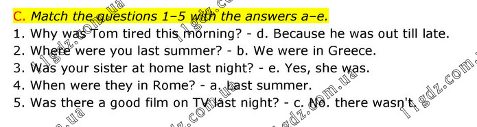C. Match the questions 1–5 with the answers a–e. 1. Why was Tom tired this morning? - d. Because he was out till late. 2. Where were you last summer? - b. We were in Greece. 3. Was your sister at home last night? - e. Yes, she was. 4. When were they in Rome? - a. Last summer. 5. Was there a good film on TV last night? - c. No. there wasn't.