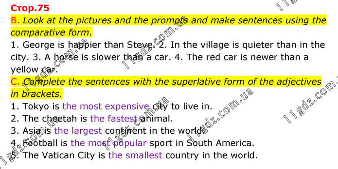 B. Look at the pictures and the prompts and make sentences using the comparative form. 1. George is happier than Steve. 2. In the village is quieter than in the city. 3. A horse is slower than a car. 4. The red car is newer than a yellow car. C. Complete the sentences with the superlative form of the adjectives in brackets. 1. Tokyo is the most expensive city to live in. 2. The cheetah is the fastest animal. 3. Asia is the largest continent in the world. 4. Football is the most popular sport in South America. 5. The Vatican City is the smallest country in the world.