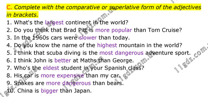 C. Complete with the comparative or superlative form of the adjectives in brackets. 1. What's the largest continent in the world? 2. Do you think that Brad Pitt is more popular than Tom Cruise? 3. In the 1960s cars were slower than today. 4. Do you know the name of the highest mountain in the world? 5. I think that scuba diving is the most dangerous adventure sport. 6. I think John is better at Maths than George. 7. Who's the eldest student in your Spanish class? 8. His car is more expensive than my car. 9. Snakes are more dangerous than bears. 10. China is bigger than Japan.