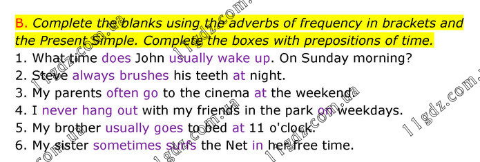 B. Complete the blanks using the adverbs of frequency in brackets and the Present Simple. Complete the boxes with prepositions of time. 1. What time does John usually wake up. On Sunday morning? 2. Steve always brushes his teeth at night. 3. My parents often go to the cinema at the weekend. 4. I never hang out with my friends in the park on weekdays. 5. My brother usually goes to bed at 11 o'clock. 6. My sister sometimes surfs the Net in her free time.