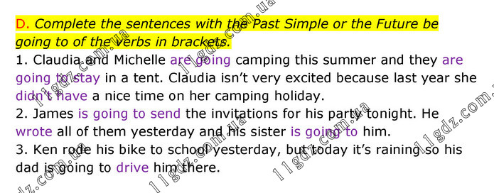 D. Complete the sentences with the Past Simple or the Future be going to of the verbs in brackets. 1. Claudia and Michelle are going camping this summer and they are going to stay in a tent. Claudia isn’t very excited because last year she didn’t have a nice time on her camping holiday. 2. James is going to send the invitations for his party tonight. He wrote all of them yesterday and his sister is going to him. 3. Ken rode his bike to school yesterday, but today it’s raining so his dad is going to drive him there.