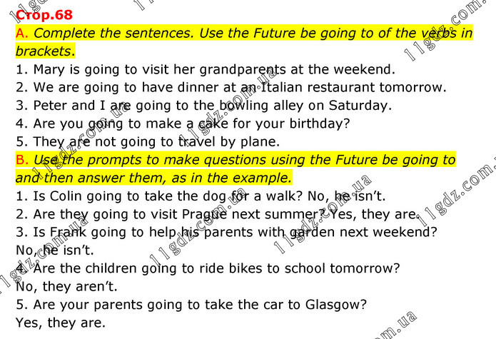 A. Complete the sentences. Use the Future be going to of the verbs in brackets. 1. Mary is going to visit her grandparents at the weekend. 2. We are going to have dinner at an Italian restaurant tomorrow. 3. Peter and I are going to the bowling alley on Saturday. 4. Are you going to make a cake for your birthday? 5. They are not going to travel by plane. B. Use the prompts to make questions using the Future be going to and then answer them, as in the example. 1. Is Colin going to take the dog for a walk? No, he isn’t. 2. Are they going to visit Prague next summer? Yes, they are. 3. Is Frank going to help his parents with garden next weekend? No, he isn’t. 4. Are the children going to ride bikes to school tomorrow? No, they aren’t. 5. Are your parents going to take the car to Glasgow? Yes, they are.