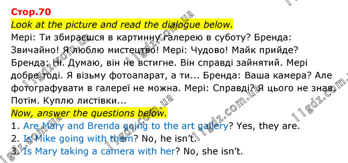 Look at the picture and read the dialogue below. Мері: Ти збираєшся в картинну галерею в суботу? Бренда: Звичайно! Я люблю мистецтво! Мері: Чудово! Майк прийде? Бренда: Ні. Думаю, він не встигне. Він справді зайнятий. Мері добре тоді. Я візьму фотоапарат, а ти... Бренда: Ваша камера? Але фотографувати в галереї не можна. Мері: Справді? Я цього не знав. Потім. Куплю листівки... Now, answer the questions below. 1. Are Mary and Brenda going to the art gallery? Yes, they are. 2. Is Mike going with them? No, he isn’t. 3. Is Mary taking a camera with her? No, she isn’t.