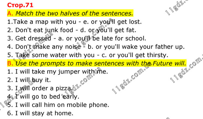 A. Match the two halves of the sentences. 1.Take a map with you - e. or you'll get lost. 2. Don't eat junk food - d. or you'll get fat. 3. Get dressed - a. or you'll be late for school. 4. Don't make any noise - b. or you'll wake your father up. 5. Take some water with you - c. or you'll get thirsty. B. Use the prompts to make sentences with the Future will. 1. I will take my jumper with me. 2. I will buy it. 3. I will order a pizza. 4. I will go to bed early. 5. I will call him on mobile phone. 6. I will stay at home.