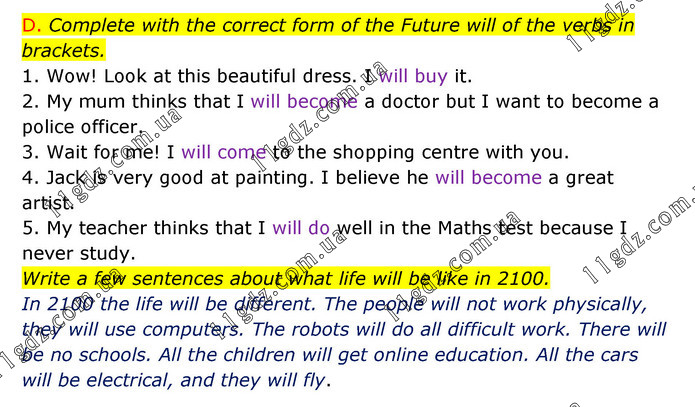 D. Complete with the correct form of the Future will of the verbs in brackets. 1. Wow! Look at this beautiful dress. I will buy it. 2. My mum thinks that I will become a doctor but I want to become a police officer. 3. Wait for me! I will come to the shopping centre with you. 4. Jack is very good at painting. I believe he will become a great artist. 5. My teacher thinks that I will do well in the Maths test because I never study. Write a few sentences about what life will be like in 2100. In 2100 the life will be different. The people will not work physically, they will use computers. The robots will do all difficult work. There will be no schools. All the children will get online education. All the cars will be electrical, and they will fly.