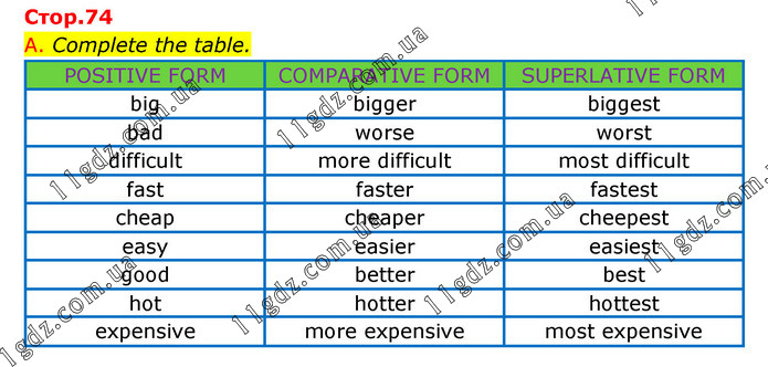A. Complete the table. POSITIVE FORM COMPARATIVE FORM SUPERLATIVE FORM big bigger biggest bad worse worst difficult more difficult most difficult fast faster fastest cheap cheaper cheepest easy easier easiest good better best hot hotter hottest expensive more expensive most expensive
