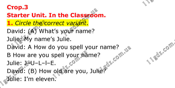 Starter Unit. In the Classroom. 1. Circle the correct variant. David: (A) What’s your name? Julie: My name’s Julie. David: A How do you spell your name? B How are you spell your name? Julie: J–U–L–l–E. David: (B) How old are you, Julie? Julie: I’m eleven.