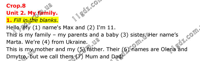 Unit 2. My family. 1. Fill in the blanks. Hello. My (1) name's Max and (2) I'm 11. This is my family – my parents and a baby (3) sister. Her name’s Marta. We’re (4) from Ukraine. This is my mother and my (5) father. Their (6) names are Olena and Dmytro, but we call them (7) Mum and Dad!