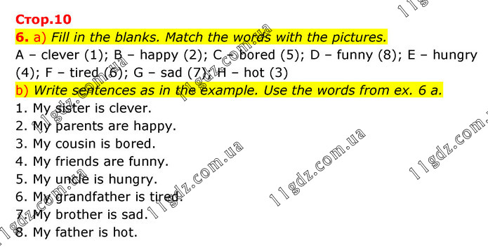 6. a) Fill in the blanks. Match the words with the pictures. A – clever (1); B – happy (2); C – bored (5); D – funny (8); E – hungry (4); F – tired (6); G – sad (7); H – hot (3) b) Write sentences as in the example. Use the words from ex. 6 a. 1. My sister is clever. 2. My parents are happy. 3. My cousin is bored. 4. My friends are funny. 5. My uncle is hungry. 6. My grandfather is tired. 7. My brother is sad. 8. My father is hot.