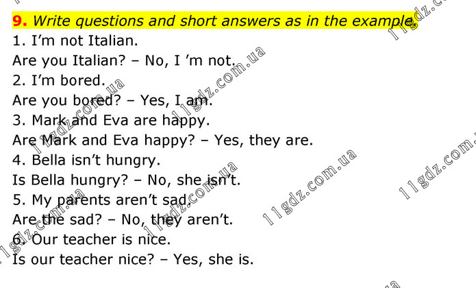 Write questions and short answers as in the example. 1. I’m not Italian. Are you Italian? – No, I ’m not. 2. I’m bored. Are you bored? – Yes, I am. 3. Mark and Eva are happy. Are Mark and Eva happy? – Yes, they are. 4. Bella isn’t hungry. Is Bella hungry? – No, she isn’t. 5. My parents aren’t sad. Are the sad? – No, they aren’t. 6. Our teacher is nice. Is our teacher nice? – Yes, she is.