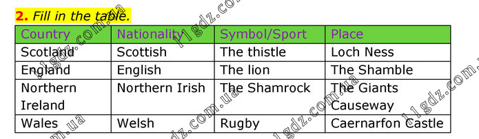 Fill in the table. Country Nationality Symbol/Sport Place Scotland Scottish The thistle Loch Ness England English The lion The Shamble Northern Ireland Northern Irish The Shamrock The Giants Causeway Wales Welsh Rugby Caernarfon Castle