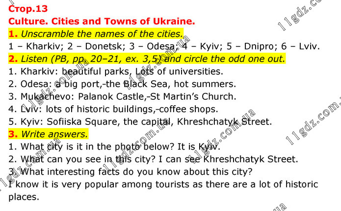Culture. Cities and Towns of Ukraine. 1. Unscramble the names of the cities. 1 – Kharkiv; 2 – Donetsk; 3 – Odesa; 4 – Kyiv; 5 – Dnipro; 6 – Lviv. 2. Listen (PB, pp. 20–21, ex. 3,5) and circle the odd one out. 1. Kharkiv: beautiful parks, Lots of universities. 2. Odesa: a big port, the Black Sea, hot summers. 3. Mukachevo: Palanok Castle, St Martin’s Church. 4. Lviv: lots of historic buildings, coffee shops. 5. Kyiv: Sofiiska Square, the capital, Khreshchatyk Street. 3. Write answers. 1. What city is it in the photo below? It is Kyiv. 2. What can you see in this city? I can see Khreshchatyk Street. 3. What interesting facts do you know about this city? I know it is very popular among tourists as there are a lot of historic places.