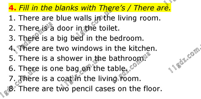 Fill in the blanks with There’s / There are. 1. There are blue walls in the living room. 2. There is a door in the toilet. 3. There is a big bed in the bedroom. 4. There are two windows in the kitchen. 5. There is a shower in the bathroom. 6. There is one bag on the table. 7. There is a coat in the living room. 8. There are two pencil cases on the floor.