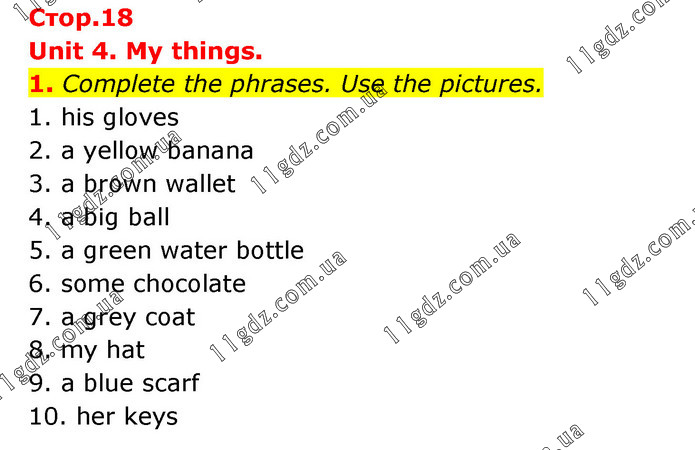 Unit 4. My things. 1. Complete the phrases. Use the pictures. 1. his gloves 2. a yellow banana 3. a brown wallet 4. a big ball 5. a green water bottle 6. some chocolate 7. a grey coat 8. my hat 9. a blue scarf 10. her keys