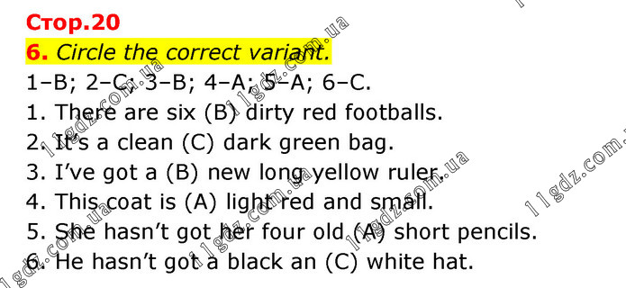 Circle the correct variant. 1–B; 2–С; 3–B; 4–A; 5–A; 6–C. 1. There are six (B) dirty red footballs. 2. It’s a clean (C) dark green bag. 3. I’ve got a (B) new long yellow ruler. 4. This coat is (A) light red and small. 5. She hasn’t got her four old (A) short pencils. 6. He hasn’t got a black an (C) white hat.