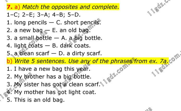 7. a) Match the opposites and complete. 1–С; 2–E; 3–A; 4–B; 5–D. 1. long pencils — C. short pencils. 2. a new bag — E. an old bag. 3. a small bottle — A. a big bottle. 4. light coats — B. dark coats. 5. a clean scarf — D. a dirty scarf. b) Write 5 sentences. Use any of the phrases from ex. 7a. 1. I have a new bag this year. 2. My brother has a big bottle. 3. My sister has got a clean scarf. 4. My mother has got light coat. 5. This is an old bag.