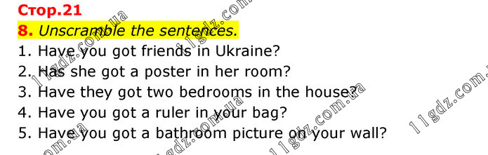 Unscramble the sentences. 1. Have you got friends in Ukraine? 2. Has she got a poster in her room? 3. Have they got two bedrooms in the house? 4. Have you got a ruler in your bag? 5. Have you got a bathroom picture on your wall?
