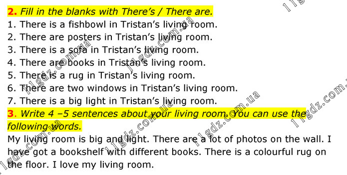 2. Fill in the blanks with There’s / There are. 1. There is a fishbowl in Tristan’s living room. 2. There are posters in Tristan’s living room. 3. There is a sofa in Tristan’s living room. 4. There are books in Tristan’s living room. 5. There is a rug in Tristan’s living room. 6. There are two windows in Tristan’s living room. 7. There is a big light in Tristan’s living room. 3. Write 4 –5 sentences about your living room. You can use the following words. My living room is big and light. There are a lot of photos on the wall. I have got a bookshelf with different books. There is a colourful rug on the floor. I love my living room.