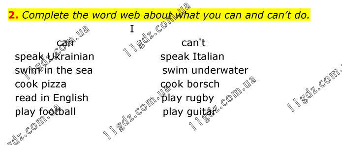 Complete the word web about what you can and can’t do. I can can't speak Ukrainian speak Italian swim in the sea swim underwater cook pizza cook borsch read in English play rugby play football play guitar