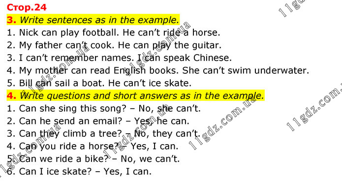 3. Write sentences as in the example. 1. Nick can play football. He can’t ride a horse. 2. My father can’t cook. He can play the guitar. 3. I can’t remember names. I can speak Chinese. 4. My mother can read English books. She can’t swim underwater. 5. Bill can sail a boat. He can’t ice skate. 4. Write questions and short answers as in the example. 1. Can she sing this song? – No, she can’t. 2. Can he send an email? – Yes, he can. 3. Can they climb a tree? – No, they can’t. 4. Can you ride a horse? – Yes, I can. 5. Can we ride a bike? – No, we can’t. 6. Can I ice skate? – Yes, I can.