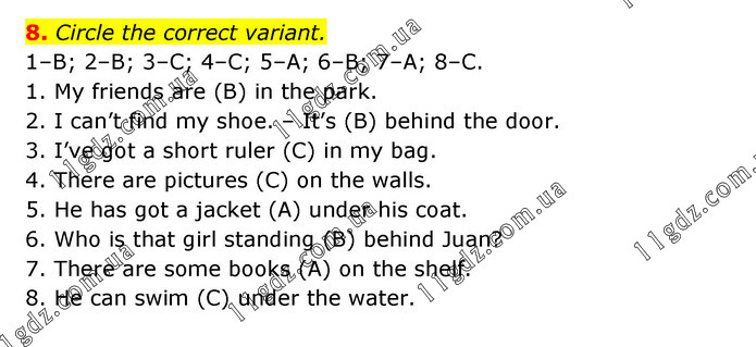 Circle the correct variant. 1–B; 2–B; 3–C; 4–C; 5–A; 6–B; 7–A; 8–C. 1. My friends are (B) in the park. 2. I can’t find my shoe. – It’s (B) behind the door. 3. I’ve got a short ruler (C) in my bag. 4. There are pictures (C) on the walls. 5. He has got a jacket (A) under his coat. 6. Who is that girl standing (B) behind Juan? 7. There are some books (A) on the shelf. 8. He can swim (C) under the water.
