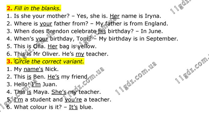 2. Fill in the blanks. 1. Is she your mother? – Yes, she is. Her name is Iryna. 2. Where is your father from? – My father is from England. 3. When does Brendon celebrate his birthday? – In June. 4. When’s your birthday, Tom? – My birthday is in September. 5. This is Olia. Her bag is yellow. 6. This is Mr Oliver. He’s my teacher. 3. Circle the correct variant. 1. My name's Nick. 2. This is Ben. He’s my friend. 3. Hello! I’m Juan. 4. This is Maya. She’s my teacher. 5. I’m a student and you’re a teacher. 6. What colour is it? – It’s blue.
