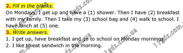 2. Fill in the blanks. On Mondays, I get up and have a (1) shower. Then I have (2) breakfast with my family. Then I take my (3) school bag and (4) walk to school. I have lunch at (5) one. 3. Write answers. 1. I get up, have breakfast and go to school on Monday mornings. 2. I like to eat sandwich in the morning.