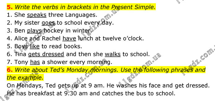5. Write the verbs in brackets in the Present Simple. 1. She speaks three Languages. 2. My sister goes to school every day. 3. Ben plays hockey in winter. 4. Alice and Rachel have lunch at twelve o’clock. 5. Boys like to read books. 6. Tina gets dressed and then she walks to school. 7. Tony has a shower every morning. 6. Write about Ted’s Monday mornings. Use the following phrases and the example. On Mondays, Ted gets up at 9 am. He washes his face and get dressed. He has breakfast at 9.30 am and catches the bus to school.