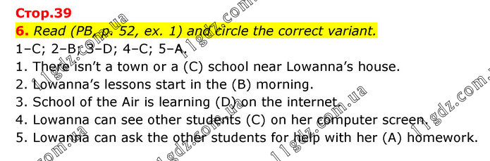 6. Read (PB, p. 52, ex. 1) and circle the correct variant. 1–С; 2–B; 3–D; 4–C; 5–A. 1. There isn’t a town or a (C) school near Lowanna’s house. 2. Lowanna’s lessons start in the (B) morning. 3. School of the Air is learning (D) on the internet. 4. Lowanna can see other students (C) on her computer screen. 5. Lowanna can ask the other students for help with her (A) homework.