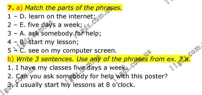 a) Match the parts of the phrases. 1 – D. learn on the internet; 2 – E. five days a week; 3 – A. ask somebody for help; 4 – B. start my lesson; 5 – C. see on my computer screen. b) Write 3 sentences. Use any of the phrases from ex. 7 a. 1. I have my classes five days a week. 2. Can you ask somebody for help with this poster? 3. I usually start my lessons at 8 o’clock.