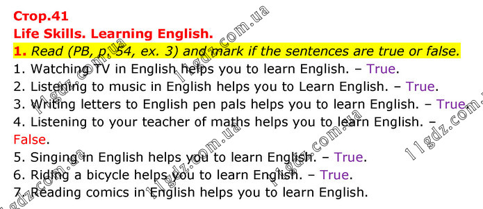 Life Skills. Learning English. 1. Read (PB, p. 54, ex. 3) and mark if the sentences are true or false. 1. Watching TV in English helps you to learn English. – True. 2. Listening to music in English helps you to Learn English. – True. 3. Writing letters to English pen pals helps you to learn English. – True. 4. Listening to your teacher of maths helps you to learn English. – False. 5. Singing in English helps you to learn English. – True. 6. Riding a bicycle helps you to learn English. – True. 7. Reading comics in English helps you to learn English.