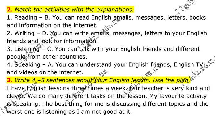 2. Match the activities with the explanations. 1. Reading – B. You can read English emails, messages, letters, books and information on the internet. 2. Writing – D. You can write emails, messages, letters to your English friends and look for information. 3. Listening – C. You can talk with your English friends and different people from other countries. 4. Speaking – A. You can understand your English friends, English TV and videos on the internet. 3. Write 4 –5 sentences about your English lesson. Use the plan. I have English lessons three times a week. Our teacher is very kind and clever. We do many different tasks on the lesson. My favourite activity is speaking. The best thing for me is discussing different topics and the worst one is listening as I am not good at it.