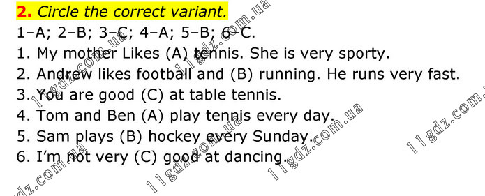 2. Circle the correct variant. 1–A; 2–B; 3–C; 4–A; 5–B; 6–C. 1. My mother Likes (A) tennis. She is very sporty. 2. Andrew likes football and (B) running. He runs very fast. 3. You are good (C) at table tennis. 4. Tom and Ben (A) play tennis every day. 5. Sam plays (B) hockey every Sunday. 6. I’m not very (C) good at dancing.