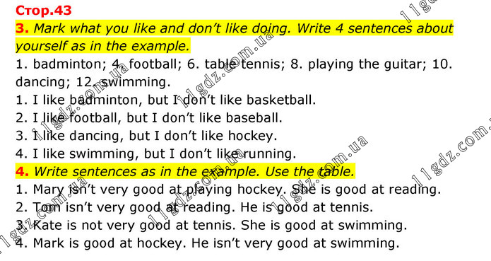 3. Mark what you like and don’t like doing. Write 4 sentences about yourself as in the example. 1. badminton; 4. football; 6. table tennis; 8. playing the guitar; 10. dancing; 12. swimming. 1. I like badminton, but I don’t like basketball. 2. I like football, but I don’t like baseball. 3. I like dancing, but I don’t like hockey. 4. I like swimming, but I don’t like running. 4. Write sentences as in the example. Use the table. 1. Mary isn’t very good at playing hockey. She is good at reading. 2. Tom isn’t very good at reading. He is good at tennis. 3. Kate is not very good at tennis. She is good at swimming. 4. Mark is good at hockey. He isn’t very good at swimming.