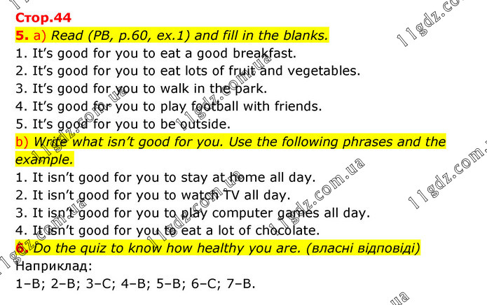 5. a) Read (PB, p.60, ex.1) and fill in the blanks. 1. It’s good for you to eat a good breakfast. 2. It’s good for you to eat lots of fruit and vegetables. 3. It’s good for you to walk in the park. 4. It’s good for you to play football with friends. 5. It’s good for you to be outside. b) Write what isn’t good for you. Use the following phrases and the example. 1. It isn’t good for you to stay at home all day. 2. It isn’t good for you to watch TV all day. 3. It isn’t good for you to play computer games all day. 4. It isn’t good for you to eat a lot of chocolate. 6. Do the quiz to know how healthy you are. (власні відповіді) Наприклад: 1–B; 2–B; 3–C; 4–B; 5–B; 6–C; 7–B.