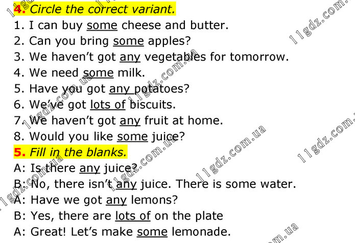 4. Circle the correct variant. 1. I can buy some cheese and butter. 2. Can you bring some apples? 3. We haven’t got any vegetables for tomorrow. 4. We need some milk. 5. Have you got any potatoes? 6. We’ve got lots of biscuits. 7. We haven’t got any fruit at home. 8. Would you like some juice? 5. Fill in the blanks. A: Is there any juice? B: No, there isn’t any juice. There is some water. A: Have we got any lemons? B: Yes, there are lots of on the plate A: Great! Let’s make some lemonade.