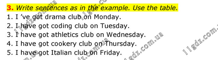Write sentences as in the example. Use the table. 1. I ’ve got drama club on Monday. 2. I have got coding club on Tuesday. 3. I have got athletics club on Wednesday. 4. I have got cookery club on Thursday. 5. I have got Italian club on Friday.