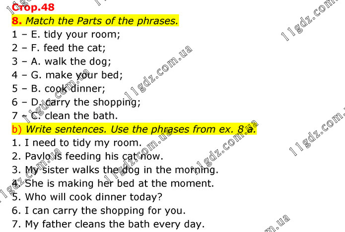8. Match the Parts of the phrases. 1 – E. tidy your room; 2 – F. feed the cat; 3 – A. walk the dog; 4 – G. make your bed; 5 – B. cook dinner; 6 – D. carry the shopping; 7 – C. clean the bath. b) Write sentences. Use the phrases from ex. 8 a. 1. I need to tidy my room. 2. Pavlo is feeding his cat now. 3. My sister walks the dog in the morning. 4. She is making her bed at the moment. 5. Who will cook dinner today? 6. I can carry the shopping for you. 7. My father cleans the bath every day.