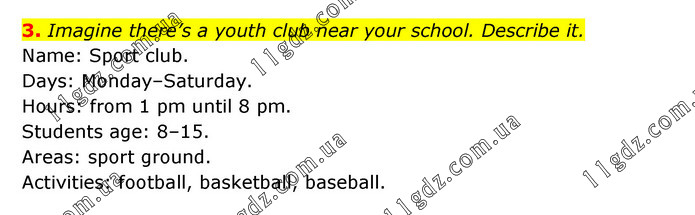 Imagine there’s a youth club near your school. Describe it. Name: Sport club. Days: Monday–Saturday. Hours: from 1 pm until 8 pm. Students age: 8–15. Areas: sport ground. Activities: football, basketball, baseball.