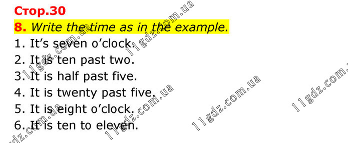 Write the time as in the example. 1. It’s seven o’clock. 2. It is ten past two. 3. It is half past five. 4. It is twenty past five. 5. It is eight o’clock. 6. It is ten to eleven.