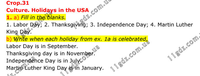 Culture. Holidays in the USA 1. a) Fill in the blanks. 1. Labor Day; 2. Thanksgiving; 3. Independence Day; 4. Martin Luther King Day. b) Write when each holiday from ex. 1a is celebrated. Labor Day is in September. Thanksgiving day is in November. Independence Day is in July. Martin Luther King Day is in January.
