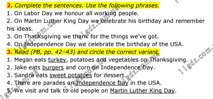 2. Complete the sentences. Use the following phrases. 1. On Labor Day we honour all working people. 2. On Martin Luther King Day we celebrate his birthday and remember his ideas. 3. On Thanksgiving we thank for the things we’ve got. 4. On Independence Day we celebrate the birthday of the USA. 3. Read (PB, pp. 42–43) and circle the correct variant. 1. Megan eats turkey, potatoes and vegetables on Thanksgiving. 2. Jake eats burgers and corn on Independence Day. 3. Sandra eats sweet potatoes for dessert. 4. There are parades on Independence Day in the USA. 5. We visit and talk to old people on Martin Luther King Day.