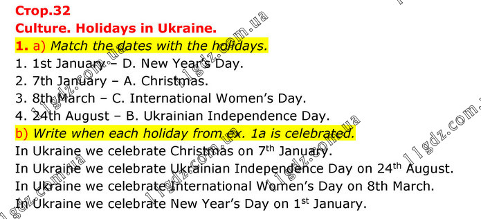 Culture. Holidays in Ukraine. 1. a) Match the dates with the holidays. 1. 1st January – D. New Year’s Day. 2. 7th January – A. Christmas. 3. 8th March – C. International Women’s Day. 4. 24th August – B. Ukrainian Independence Day. b) Write when each holiday from ex. 1a is celebrated. In Ukraine we celebrate Christmas on 7th January. In Ukraine we celebrate Ukrainian Independence Day on 24th August. In Ukraine we celebrate International Women’s Day on 8th March. In Ukraine we celebrate New Year’s Day on 1st January.
